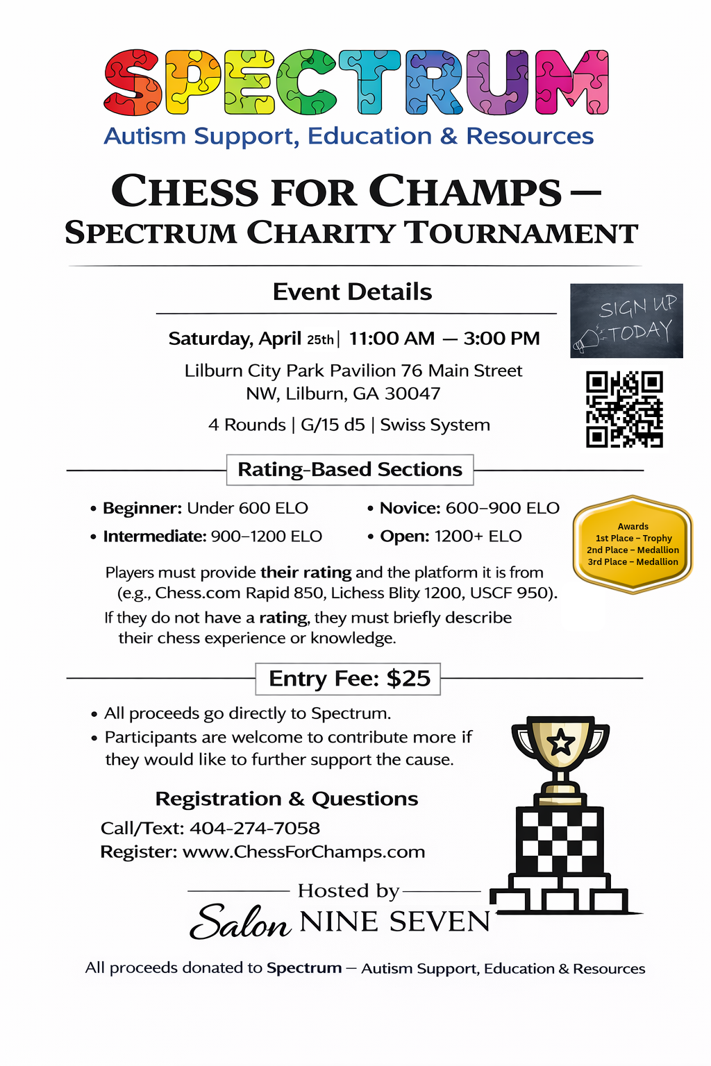 April is Autism Awareness Month. This show will benefit Spectrum, a local nonprofit that provides programs, events, and resources for autism at all ages. Before the show, there will be a non-rated Chess for Champs’ Chess Tournament. All proceeds from the chess tournament will be donated to Spectrum. This tournament will take place in Lilburn City Park and begin at 1:30 pm and end at 4:30 pm. Directly following the chess tournament will be our Art Show at Salon Nine Seven from 5:00 pm to 8:00 pm. We will have artists of all ages and several artists who are on the spectrum. This is a great way to support your community. Come out for a fun-filled night! Complimentary snacks and drinks will be available while supplies last.